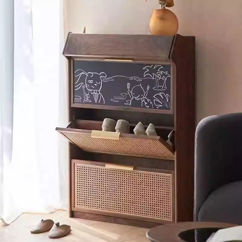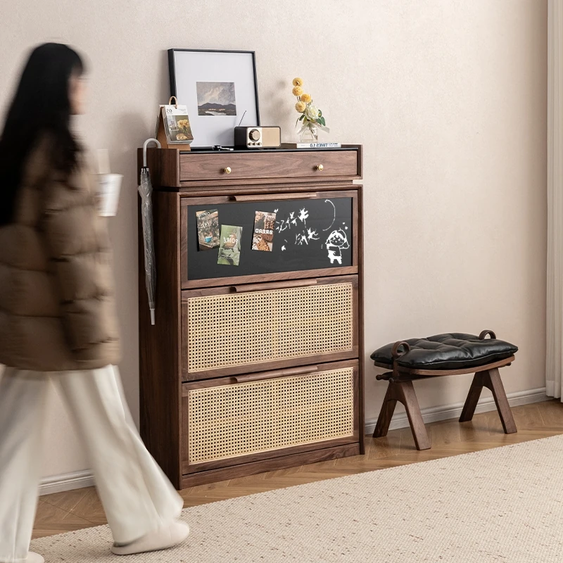 妙梵「谷雨シューズキャビネット」天然ブラックウォールナット製、実用的でスタイリッシュな靴箱。家用・引き出し式・ラタン編みデザイン、玄関をおしゃれに演出し、靴の整理も簡単に!