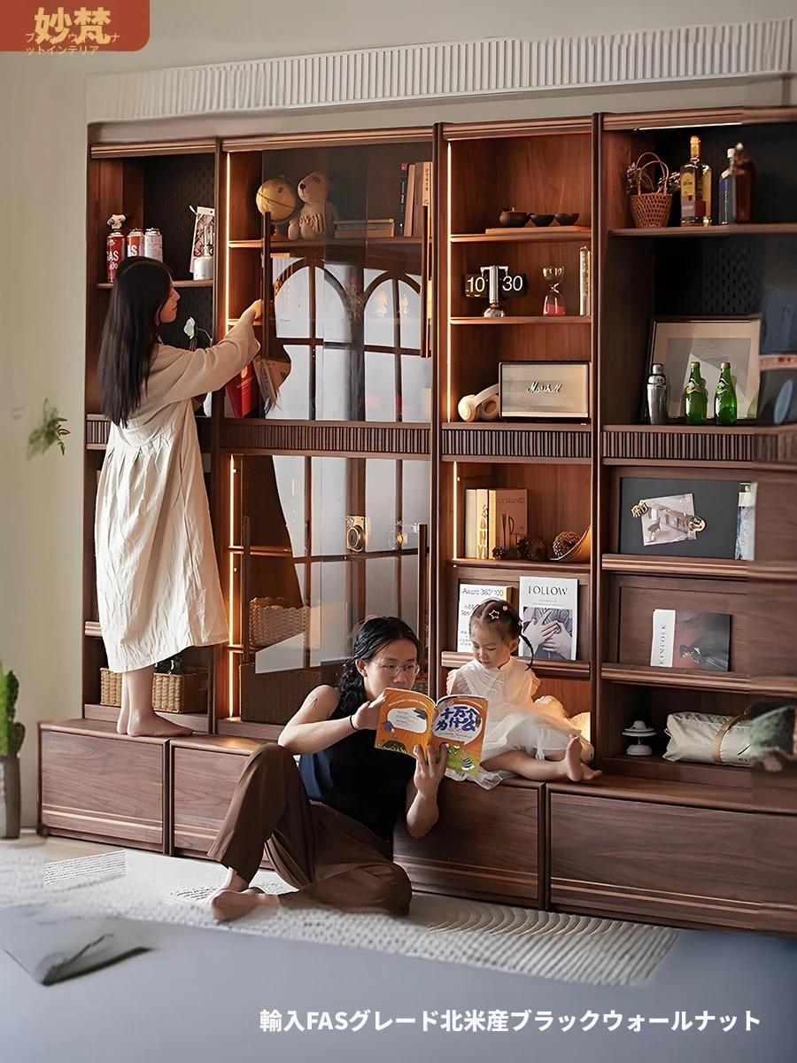 妙梵「星羅」北米産ブラックウォールナット無垢材書棚一体型壁面収納キャビネット - スタイリッシュなリビングルームに最適な組み合わせ家具!