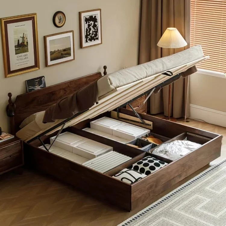 Miaofan "Dream Haven" North American Black Walnut Gas Lift Storage Bed - 1.5m & 1.8m High-Box Design for Maximized Bedroom Storage