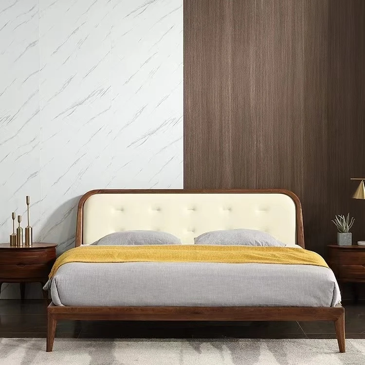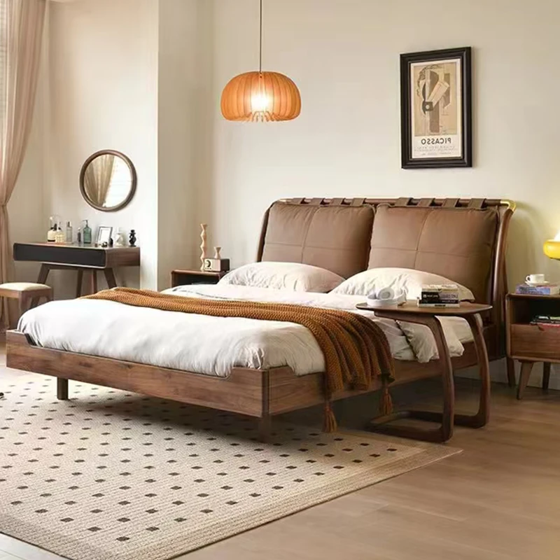 Miaofan "Walnut Melody" North American Black Walnut Bed - Scandinavian Style Genuine Leather Queen Size Bed, Minimalist Design, Available in 1.5m and 1.8m Options