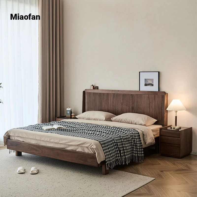Miaofan "Yuanbei Bed" - Solid North American Black Walnut Wood King Size Bed (1.8m) - Modern Minimalist Bedroom Furniture for Stylish Living