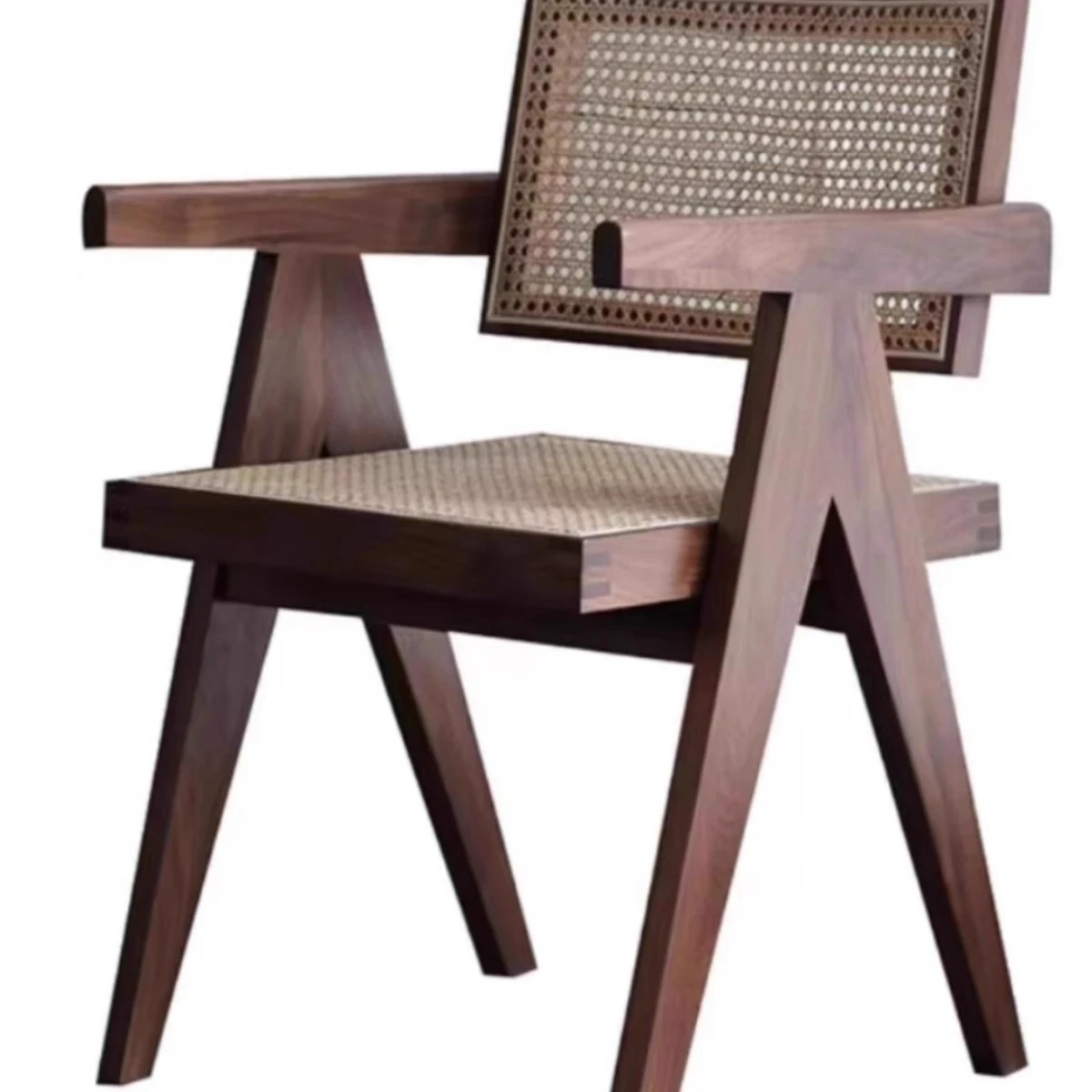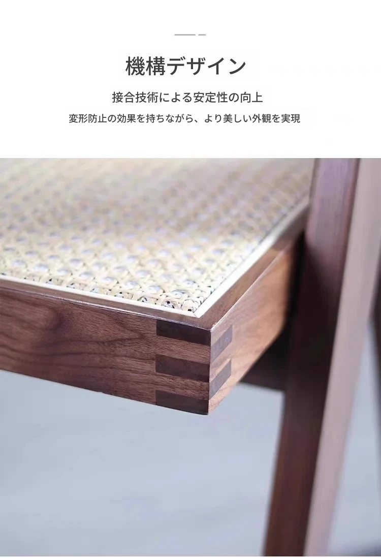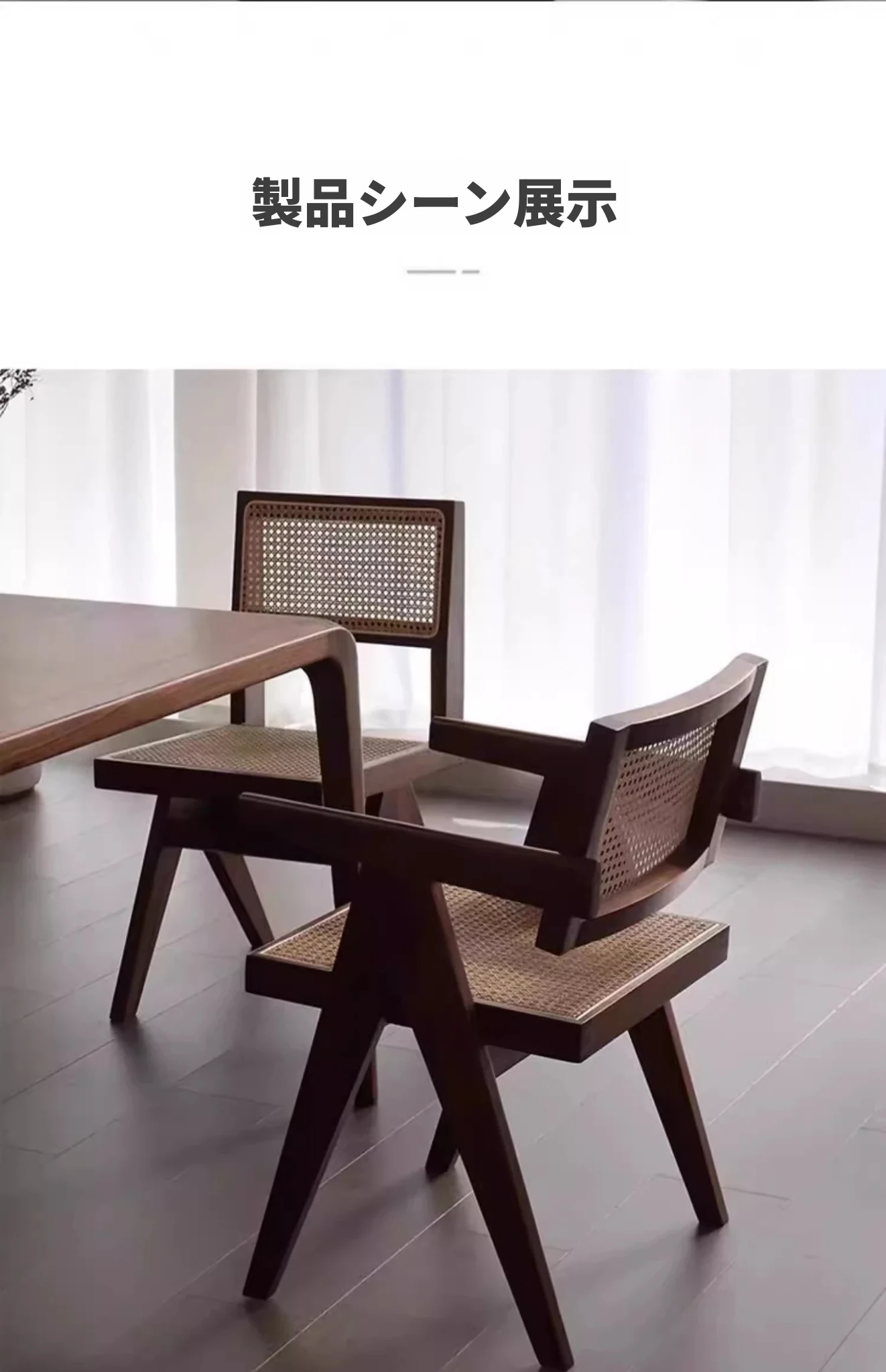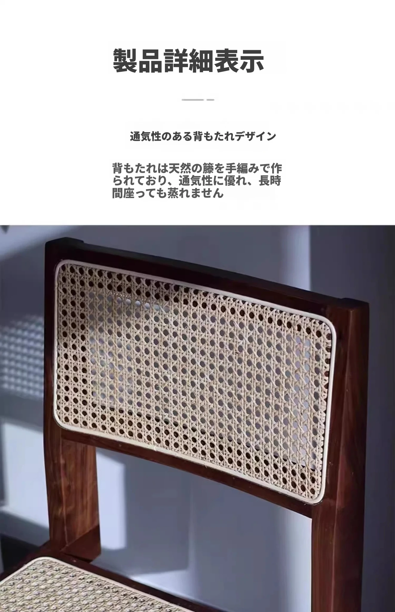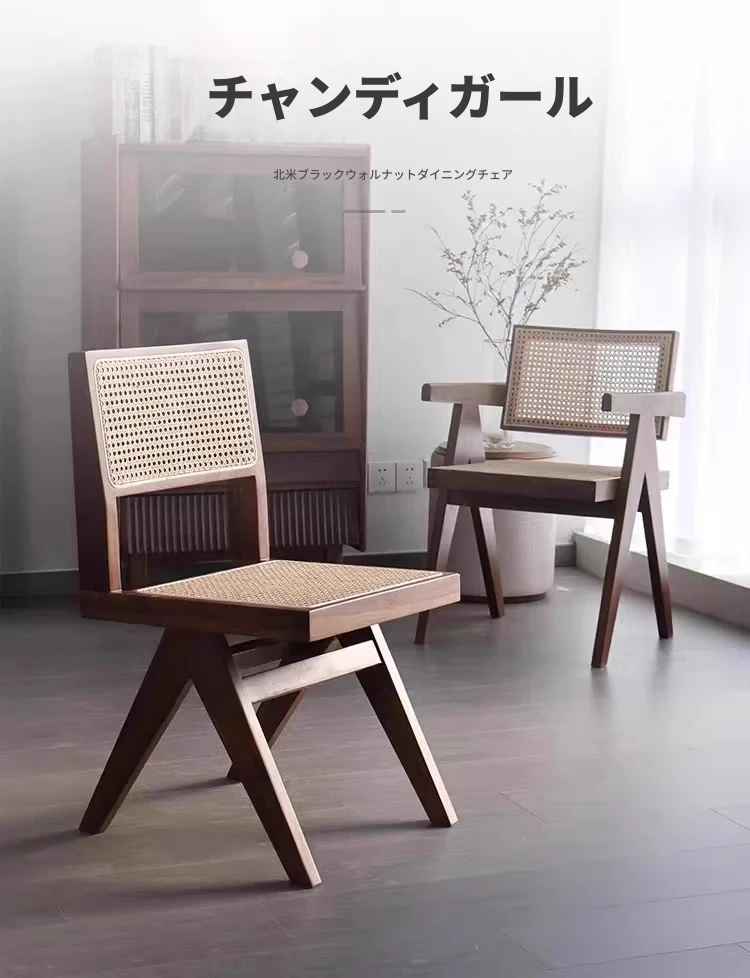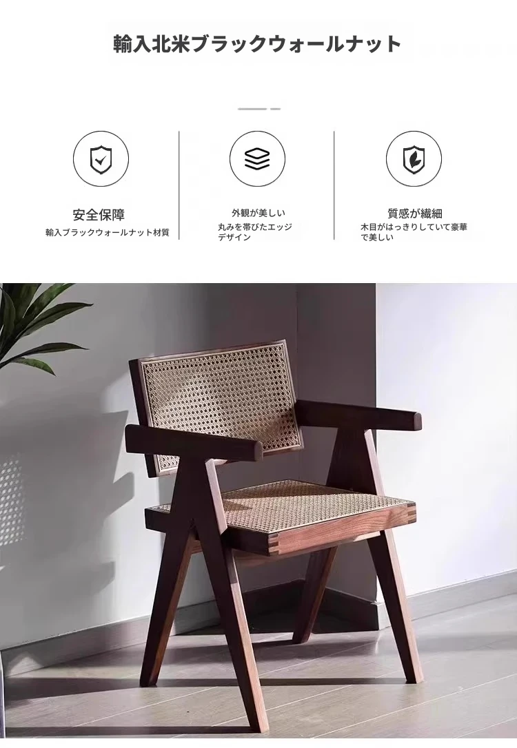 妙梵「チャンディガールチェア」北米産ブラックウォールナット無垢材使用、レトロデザインの籐編み背もたれ付きアームチェア - 快適さとスタイルを兼ね備えた理想の家具。