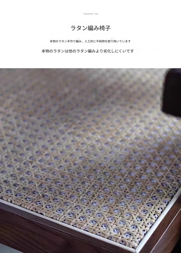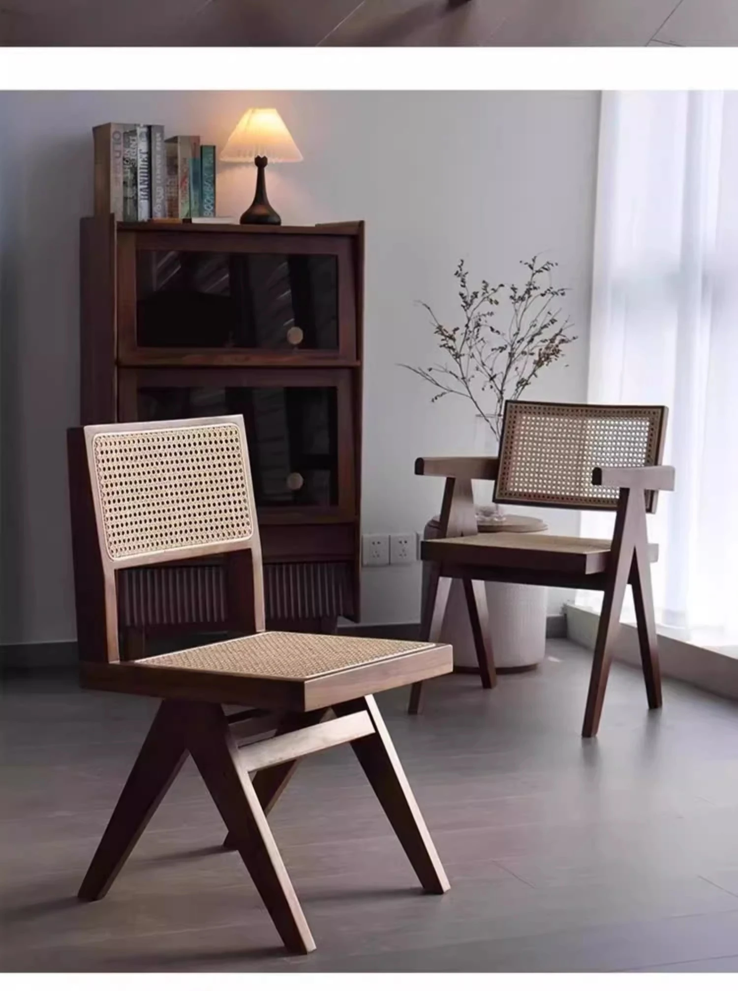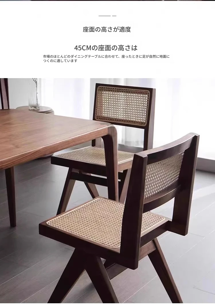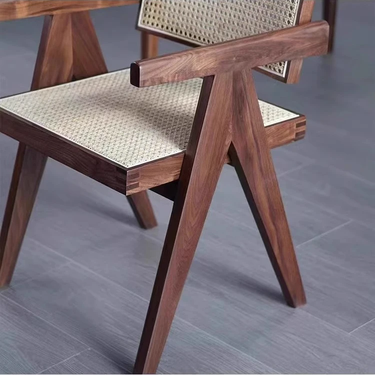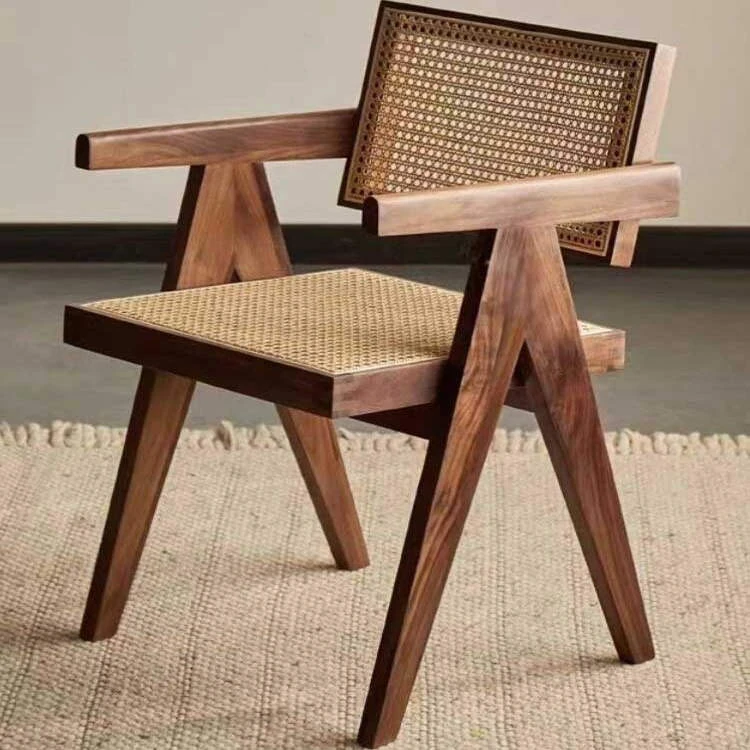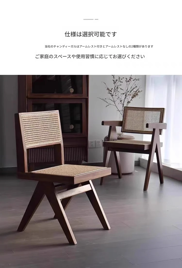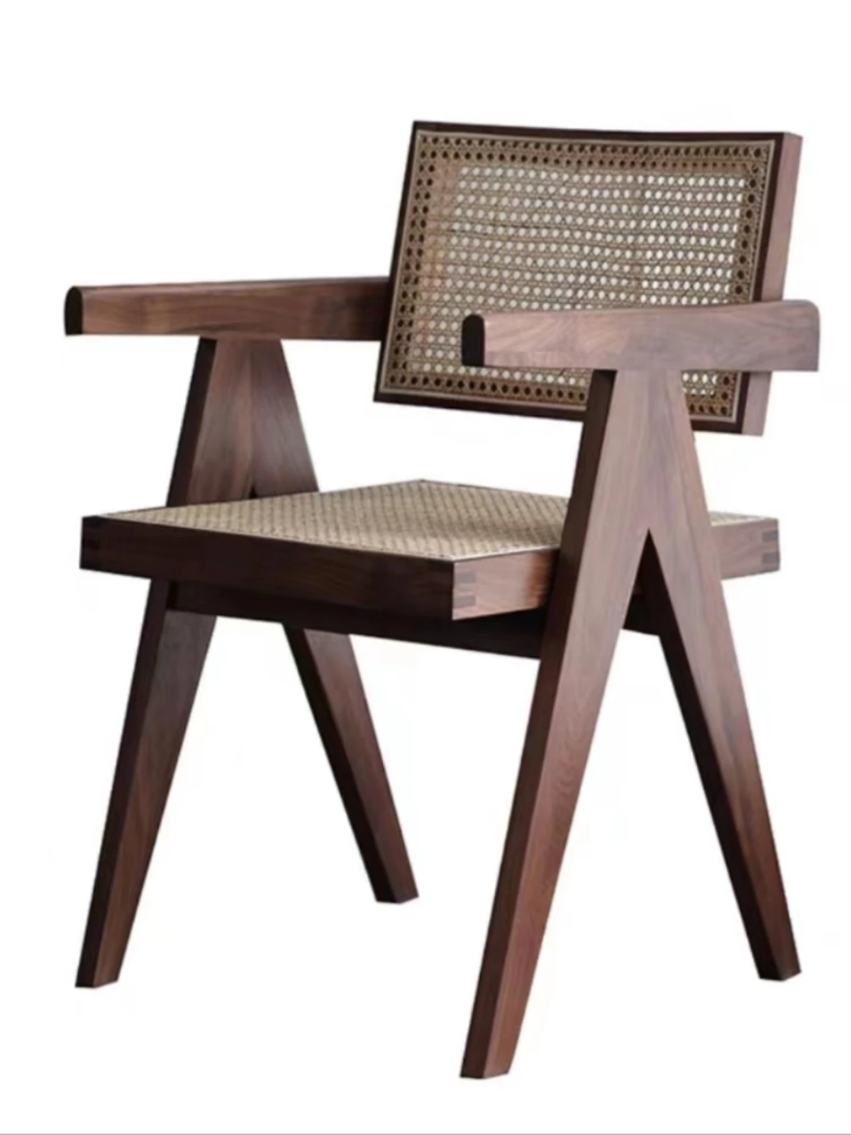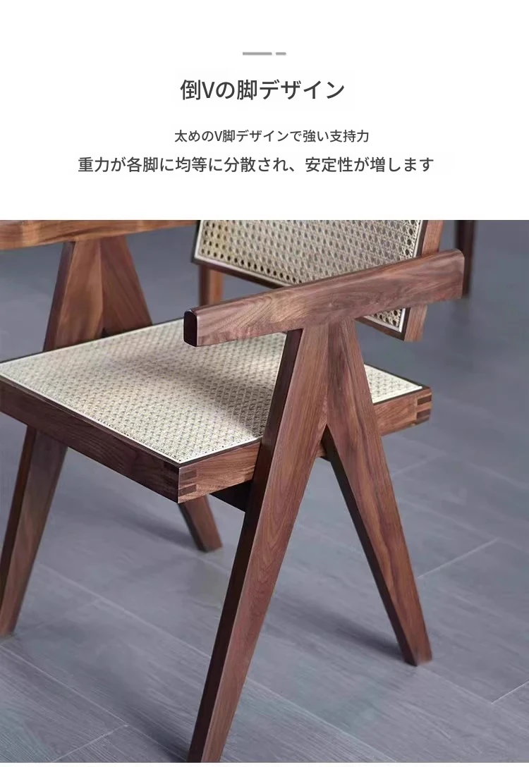 妙梵「チャンディガールチェア」北米産ブラックウォールナット無垢材使用、レトロデザインの籐編み背もたれ付きアームチェア - 快適さとスタイルを兼ね備えた理想の家具。