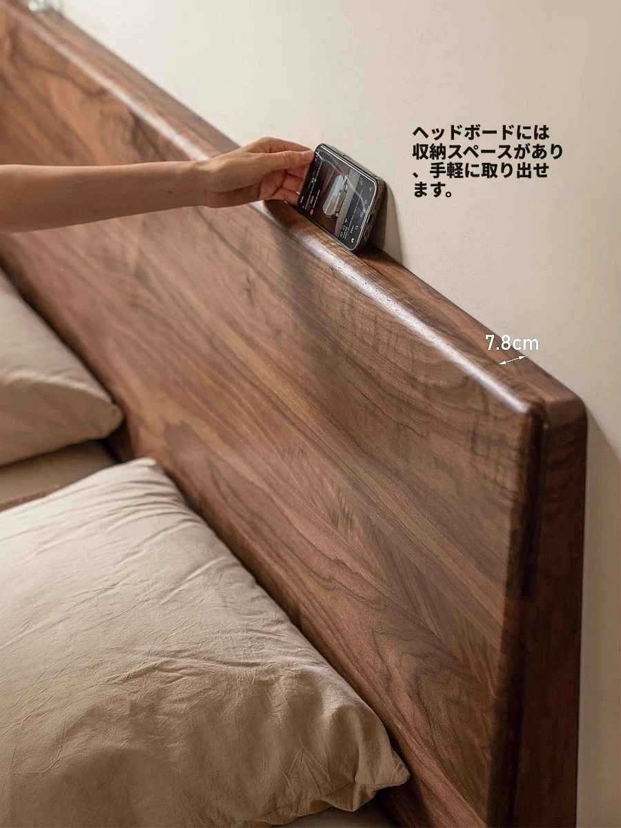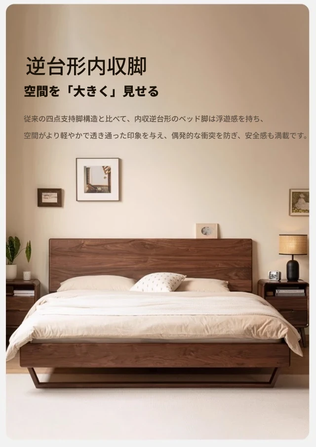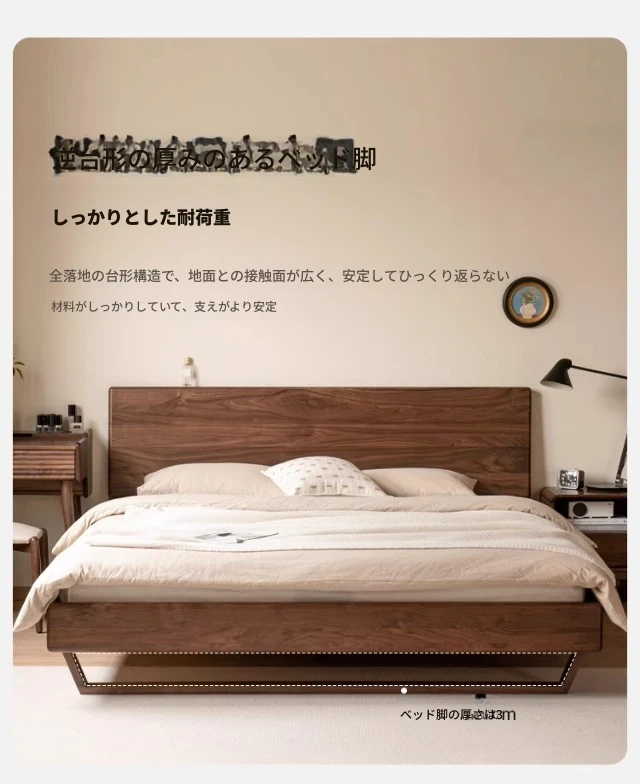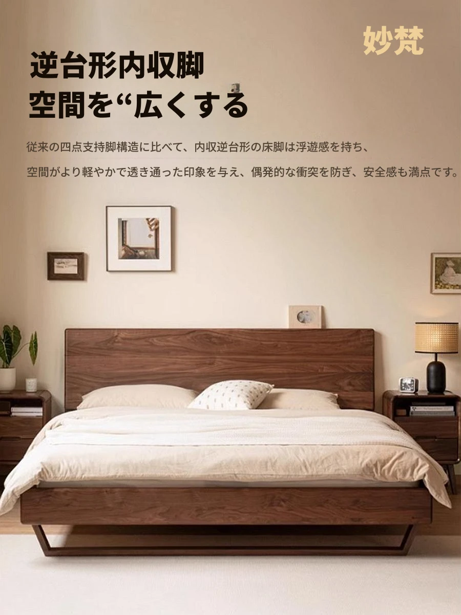 妙梵「ライン」北米ブラックウォールナット無垢材使用の高級全浮遊式ベッド、1.8mダブルベッド、洗練されたデザインで贅沢な空間を演出!2025年新作