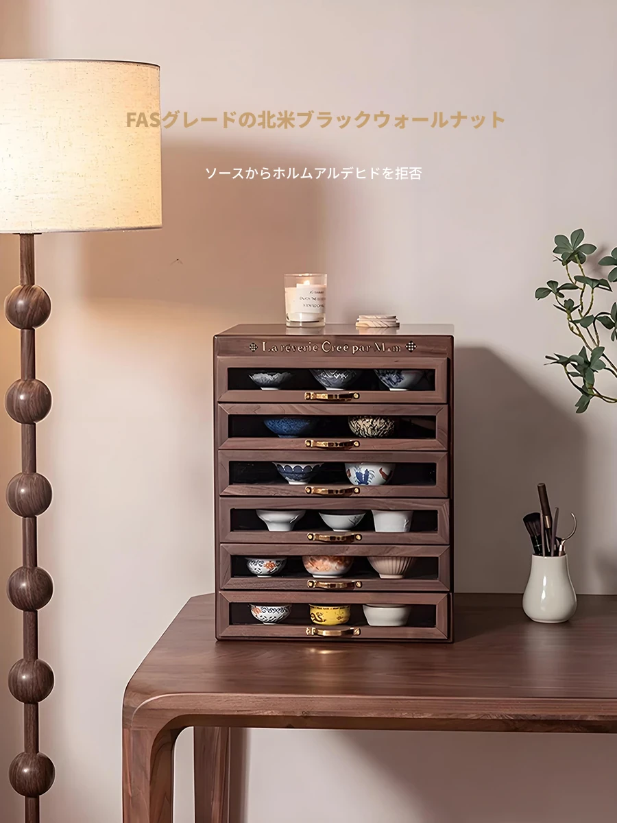 妙梵「6段抽出式」大人用ティーセット収納キャビネット - ウォールナット無垢材製、歯科用キャビネットとしても最適!文具やアクセサリーを美しく整理整頓!おしゃれで機能的な収納家具です。